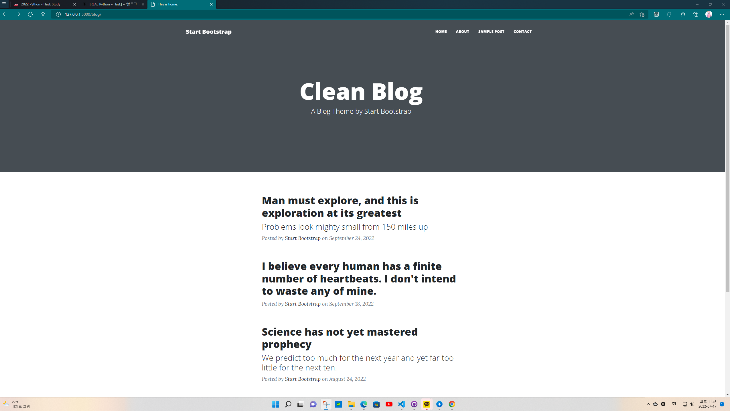 다음으론 Bootstrap을 사용해 flask에서 정적 파일을 다뤄보겠다. Clean Blog - Bootstrap Blog Theme - Start Bootstrap 사이트에서 템플릿을 다운받을 수 있다.