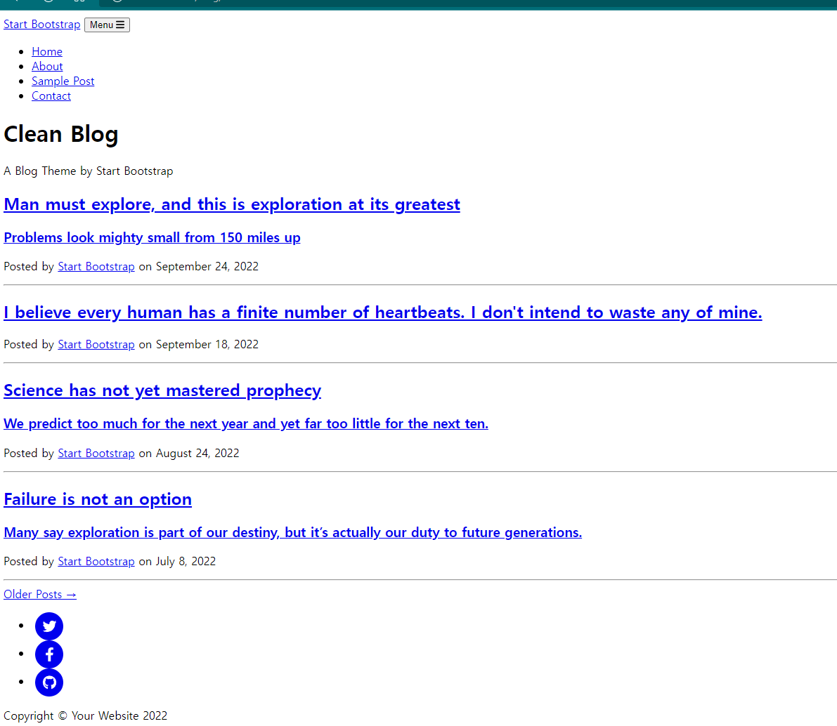 위와 같은 작업으로 css연결 작업을 마쳤다면 아까처럼 깨지는 화면이 아닌 아래와 같은 결과물을 얻을 수 있을 것이다.