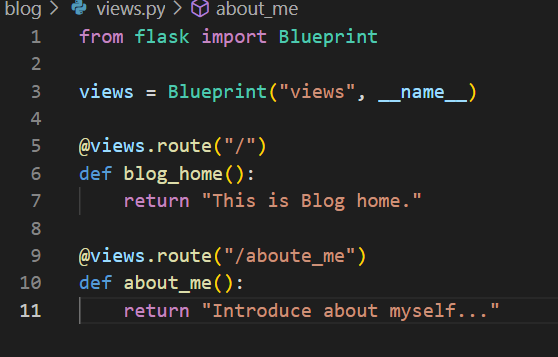 2번째 줄:views라는 변수에 blueprint를 사용하기 위해 'views'라는 이름으로 설정하고 __name__으로 views의 위치를 알려준 것이다.